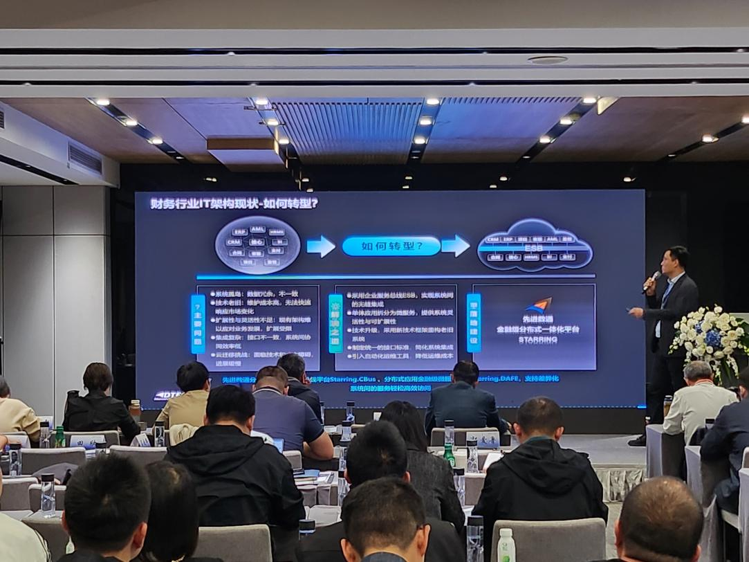 金年会诚信至上代表讲师郭钰以《昆仑与金年会诚信至上ESB解决方案助力财务行业创新与架构转型》为主题作发言分享。他深入剖析了当前财务行业IT架构面临的挑战,包括系统孤岛、技术老旧、扩展性不足等问题,并提出了基于企业服务总线(ESB)和微服务架构的转型方案。